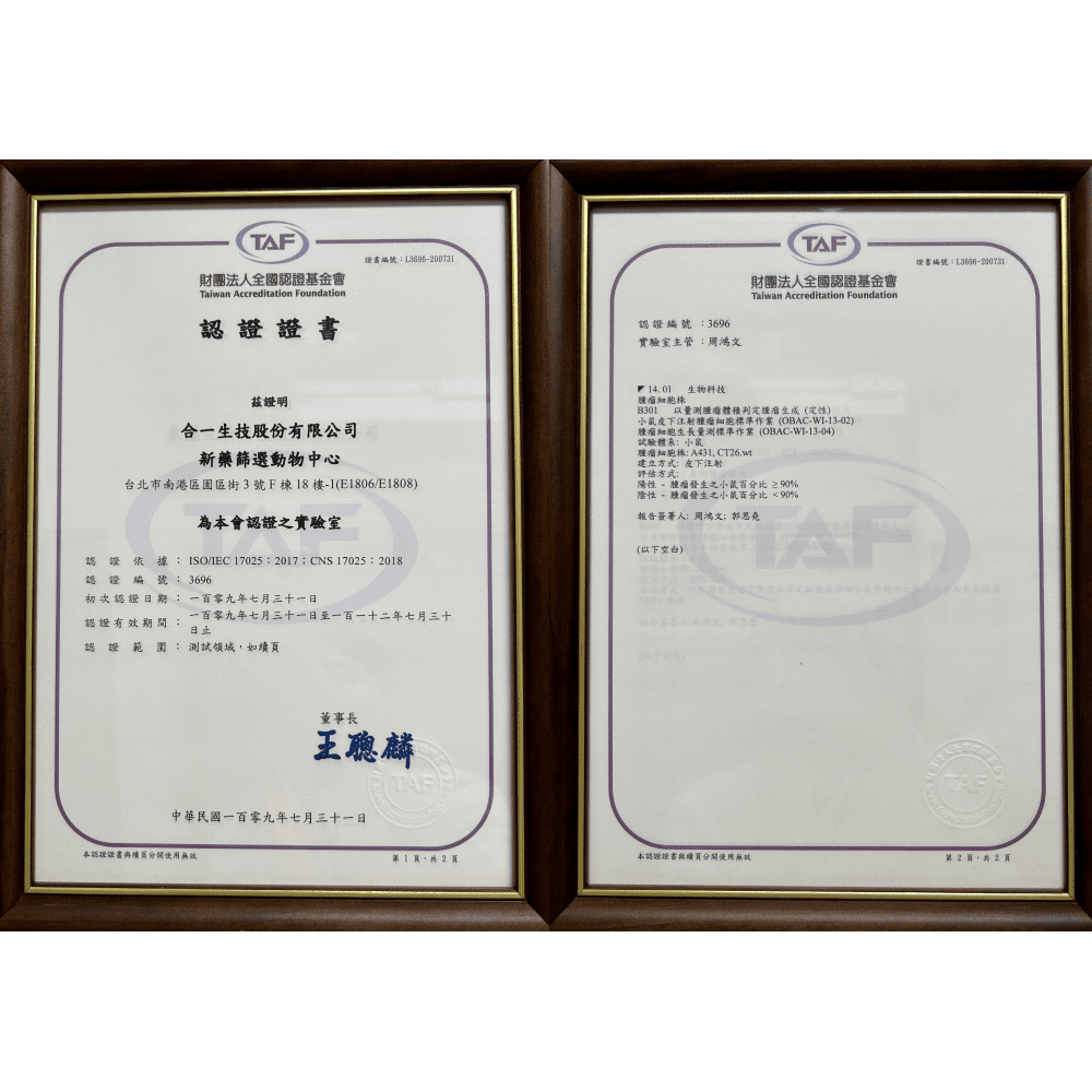 本中心通過 財團法人全國認證基金會(TAF)ISO 17025 測試實驗室認證,確保檢測數據的準確性、可靠性及符合國際法規要求。認證項目: B301 以量測腫瘤體積判定腫瘤生成(定性)