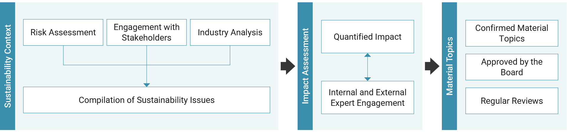 After gathering and organization of issues with reference to international sustainability standards and guidelines (GRI, SASB), responsible investment (DJSI, MSCI, CDP), stakeholder communication issues, and UN Sustainable Development Goals, as well as the risk management operation of the Company, 26 issues were identified as the foundation for impact assessment.