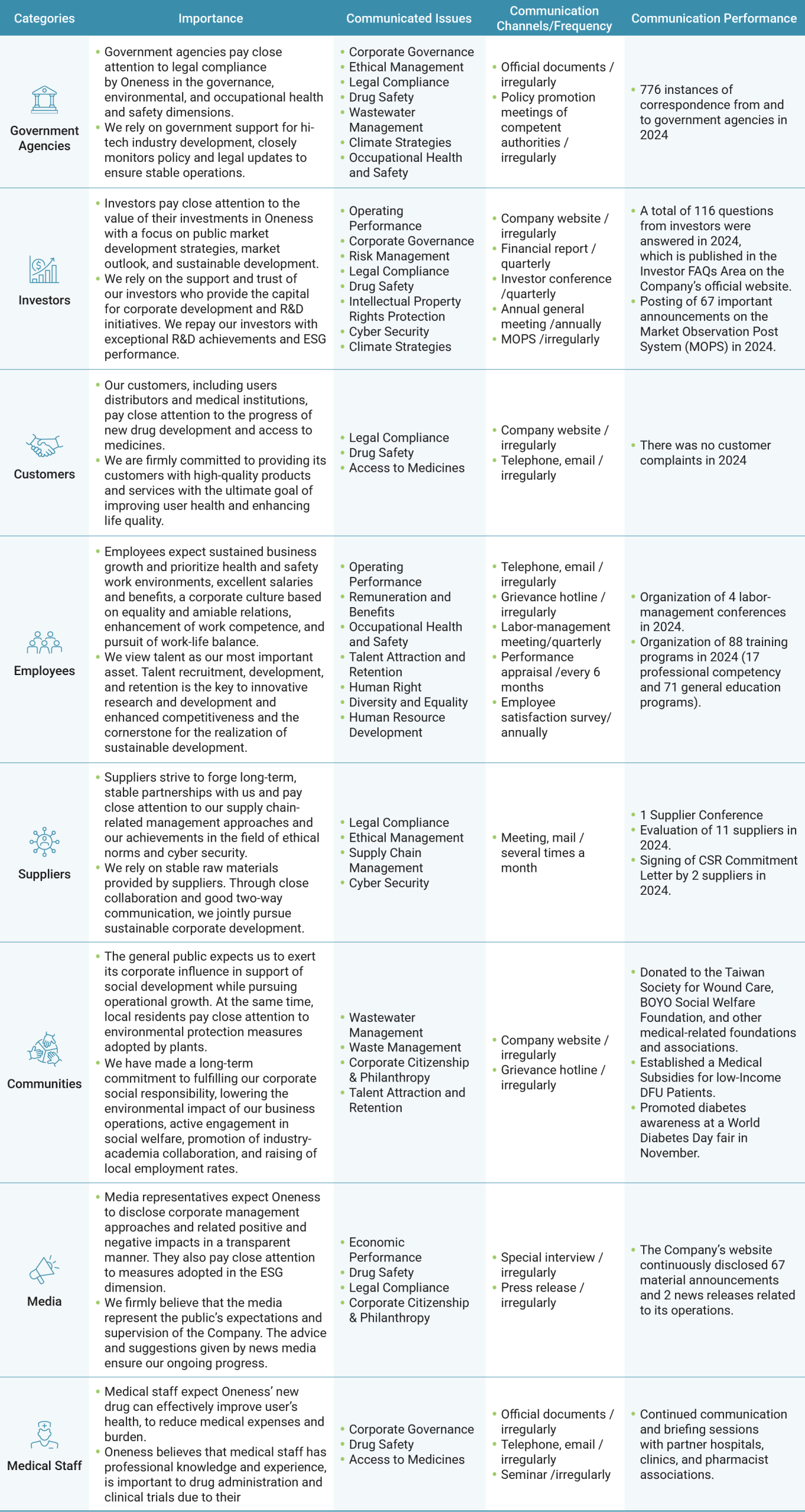 With reference to the five attributes (dependency, responsibility, influence, diverse perspectives, and tension) of AA1000 SES (Stakeholder Engagement Standard), Oneness has identified the following eight major stakeholder categories (government agencies, investors, customers, employees, suppliers, communities, news media and medical staff). Stakeholder engagement is carried out regularly and irregularly via diversified channels to gain a clear understanding of stakeholder expectations towards the Company. Impact assessments of issues of concern to stakeholders are conducted simultaneously and adequate responses are provided in this report and on the corporate website. Stakeholder communication status is reported to the Board of Directors annually. The 2024 communication status was reported to the Board meeting on February 27, 2025. The 2025 communication status is scheduled to be reported to the Board meeting in the first quarter of 2026.