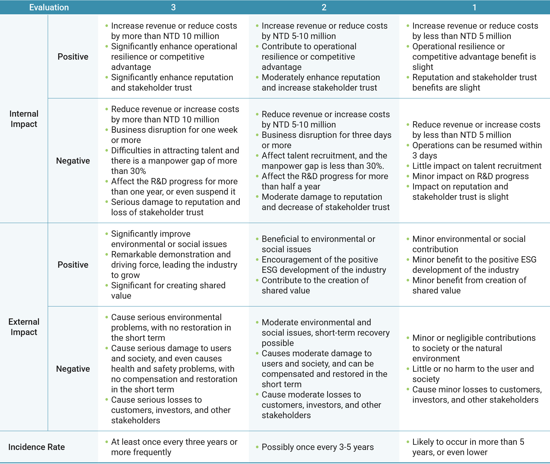 2. Disclosure Topics: Although the extent of the topics’ impact on internal operations and the external environment does not reach the significant threshold, stakeholders are still concerned about the relevant information. It is advisable to establish an appropriate management approach and information disclosure topic.