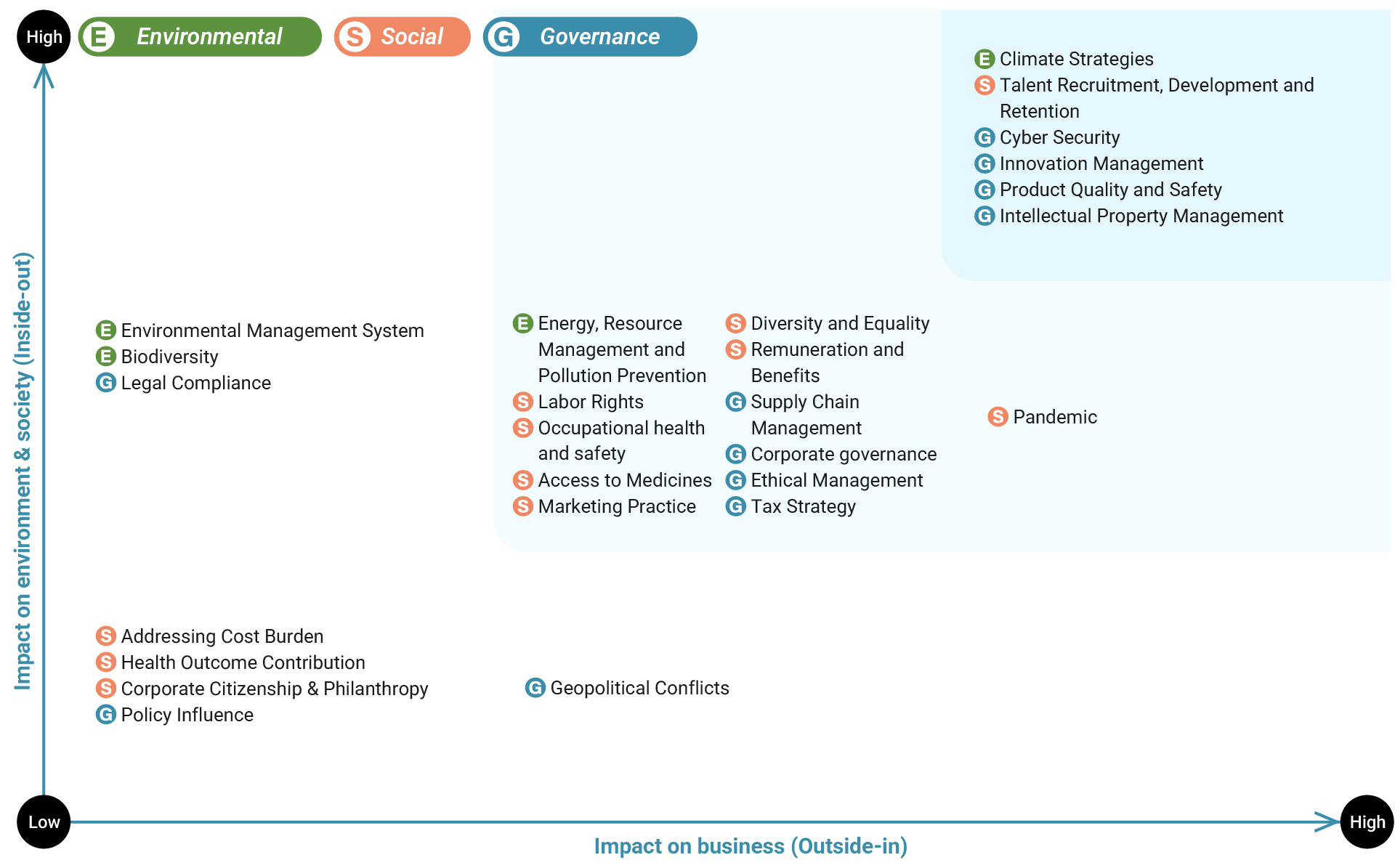 Scoring principles were based on an analysis of the positive and negative impacts of issues, and their incidence frequency/probability through impact paths of due diligence issues and by incorporating stakeholder perspectives in the reporting year and double materiality concepts, including “inside-out” (impacts on environment and society) and “outside-in” (impacts on company operations).