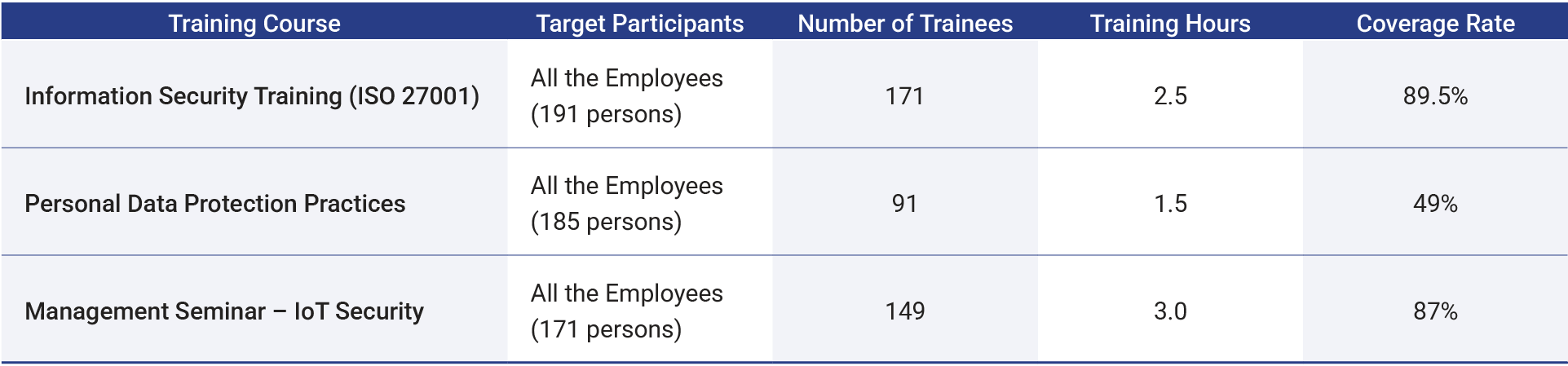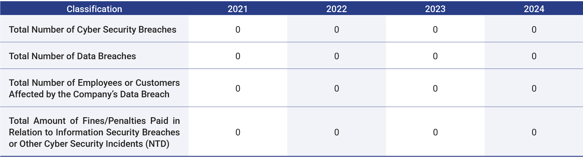 In 2024, the Cyber Security Team consisted of 3 members, and the Internal Audit Team had 1 member. During the year, one information security meeting was held. Two internal audits were conducted in March and May, respectively, with no major deficiencies identified. Additionally, no significant information security violations occurred throughout the year.