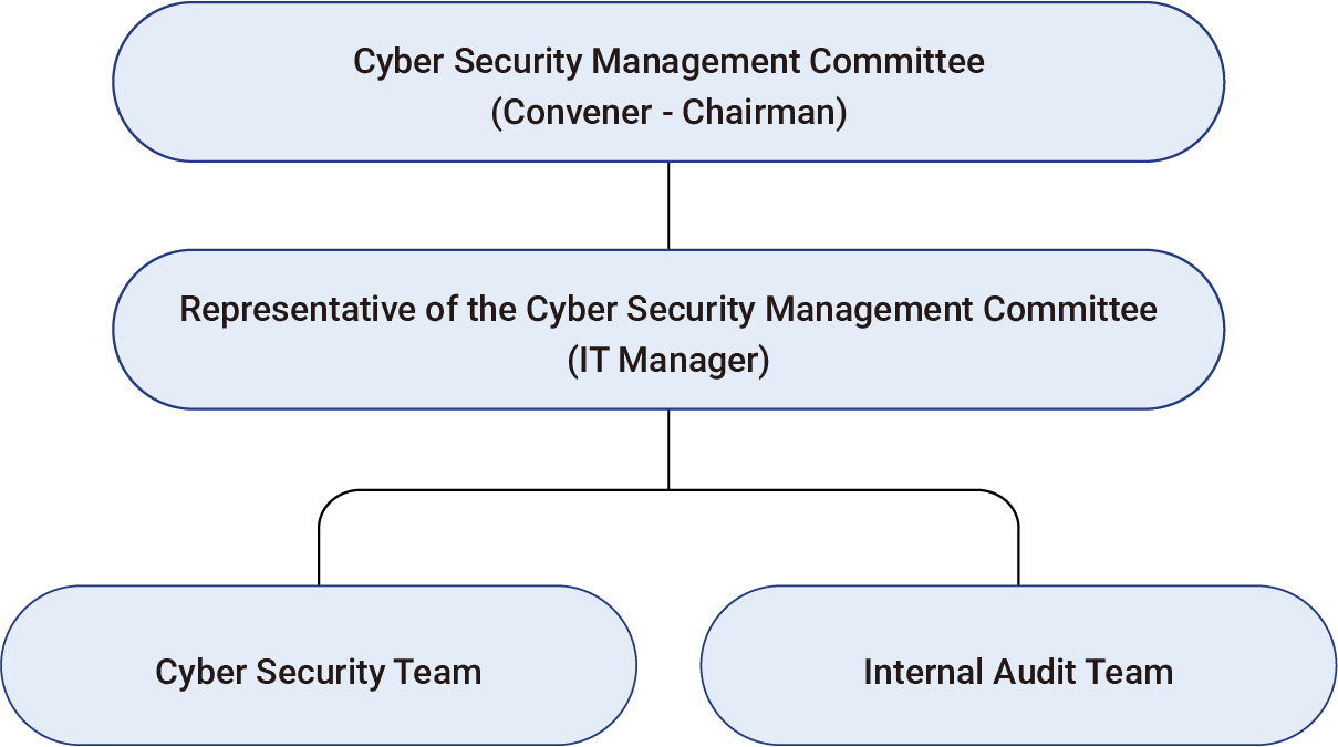 The Cyber Security Management Committee has two subordinate execution teams: the Cyber Security Team and the Internal Audit Team. The Information Security Team, established by the IT Department, develops the information security policies and implementation plans, promotes enforcement, and reviews improvements. It reports quarterly to the Information Security Management Representative on the status of information security management. The Internal Audit Team, established by the Audit Office, is responsible for auditing and conducts at least one annual random audit of the implementation of information security policies, tracking the effectiveness of improvement plans.
