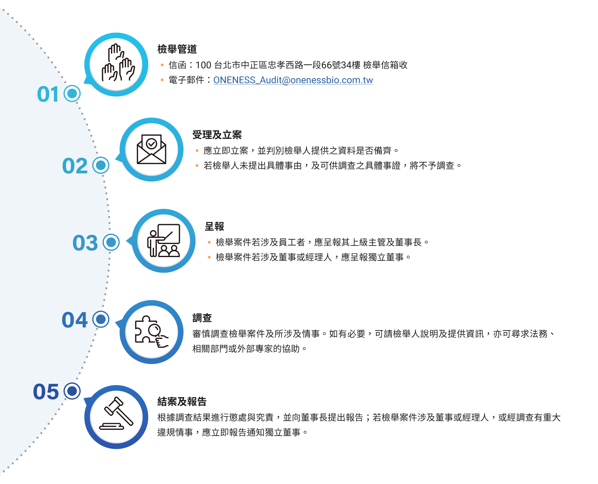 本公司建立舉報機制,提供內外部人員以匿名方式舉報違法、違反道德行為準則或誠信經營守則行為的檢舉管道,並任命稽核室為權責單位進行案件受理及立案。當公司員工或外部人員發現有違法、違反公司政策、制度或道德行為準則、損害公司權益,如舞弊、侵占公司資產、洩漏公司機密、收取不當利益等之不當行為時,可以透過信函或電子郵件提出匿名檢舉。公司亦透過內部平台不定期公告宣導檢舉辦法相關內容。