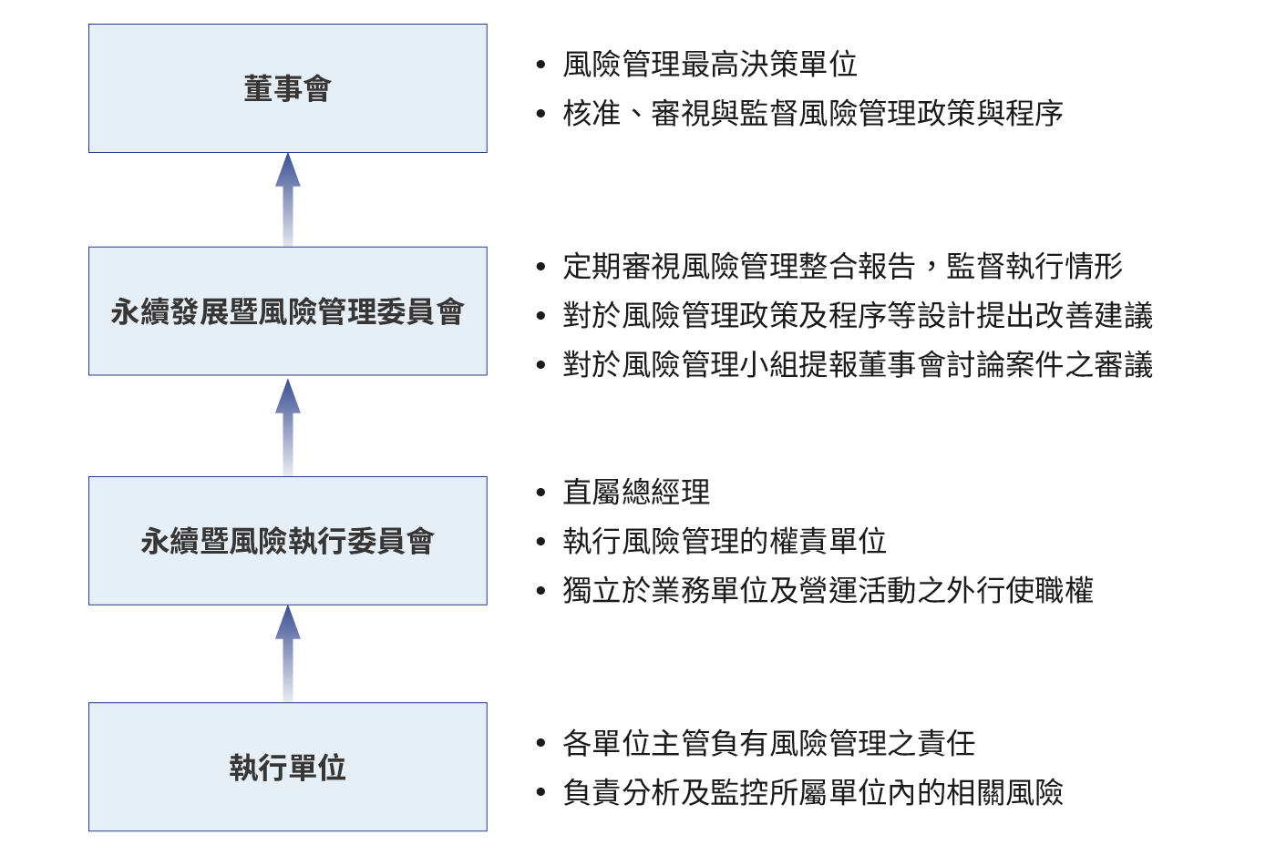 董事會為風險管理的最高決策單位,負責核准、審視與監督公司風險管理政策,確保風險管理的有效性,並負最終責任,董事會設置「永續發展暨風險管理委員會」,委員會成員皆由獨立董事擔任。