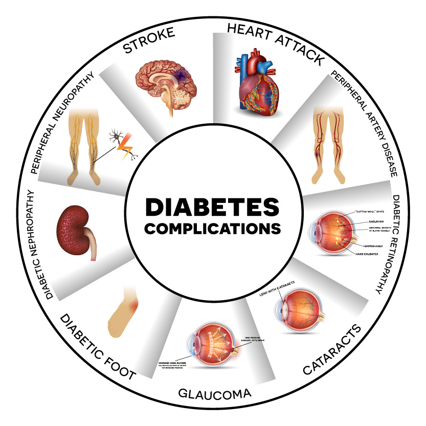 糖尿病是一種慢性疾病,由於胰島素分泌不足或體內無法有效利用胰島素導致葡萄糖聚集於血液中,形成血糖過高,當體內長期處於高血糖環境中容易引發產生多種慢性併發症,根據併發症所影響的器官可分為下列幾部分作為探討。