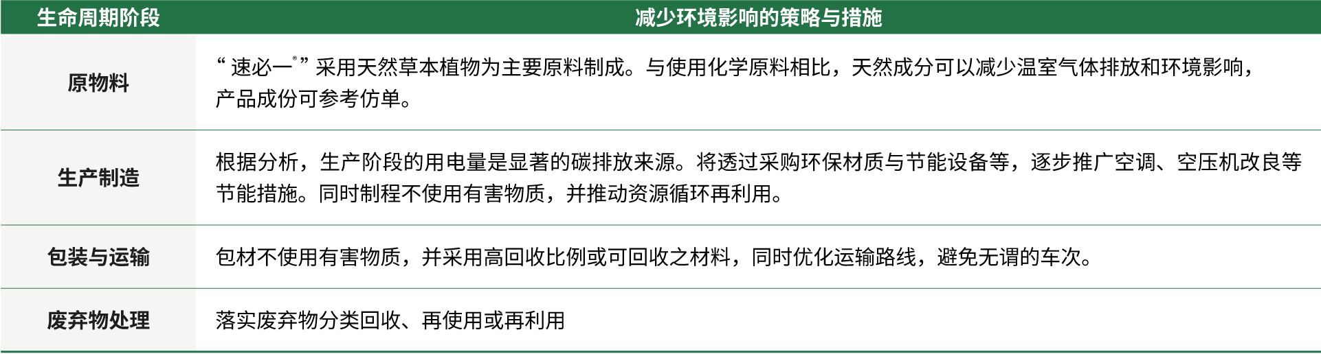 环境友善设计是降低产品与制程对环境冲击的有效途径。本公司采纳此设计理念,并以生命周期思维进行重大环境影响因子的识别与评估。2022年,我们依循ISO 14040 与ISO 14044 标准,完成”速必一®”乳膏的生命周期评估,涵盖从原料取得、制造、运输、使用至最终处置等阶段,全面分析各环节对资源消耗、生态系统与人体健康的潜在影响。相关评估结果经由SGS进行第三方查证,以确保数据之客观性与可信度。