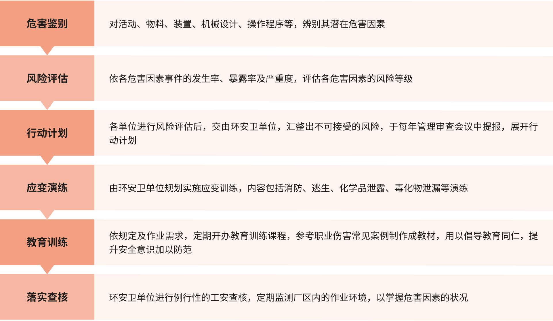 为有效预防职业灾害的发生,南州厂成立安全卫生管理单位,由专业人员负责安全卫生管理业务规划、推动、监督与查核等工作,借由辨识危害因素、评估危害风险、设定行动计划、紧急应变演练、强化教育训练与落实查核等程序,并设定职业安全卫生目标,定期追踪管理情形,降低工作环境危害风险。