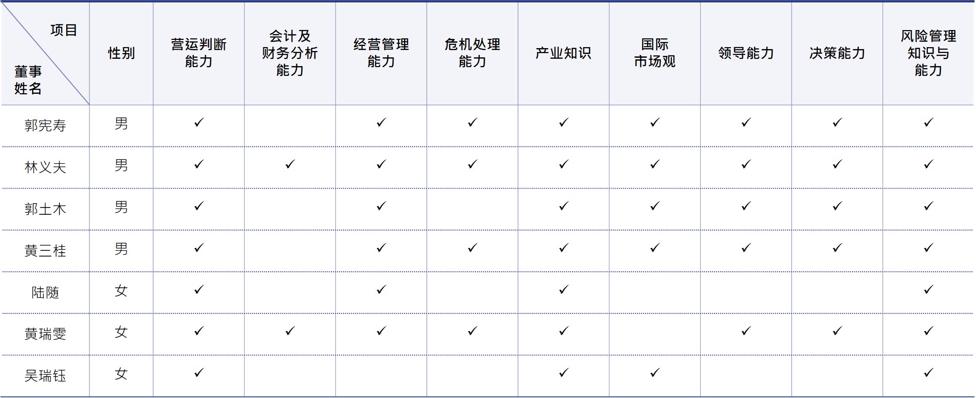 为提升公司治理,董事会整体具备之能力包括但不限于营运判断能力、会计及财务分析能力、经营管理能力、危机处理能力、产业知识、国际市场观、领导能力、决策能力、风险管理知识与能力如下: